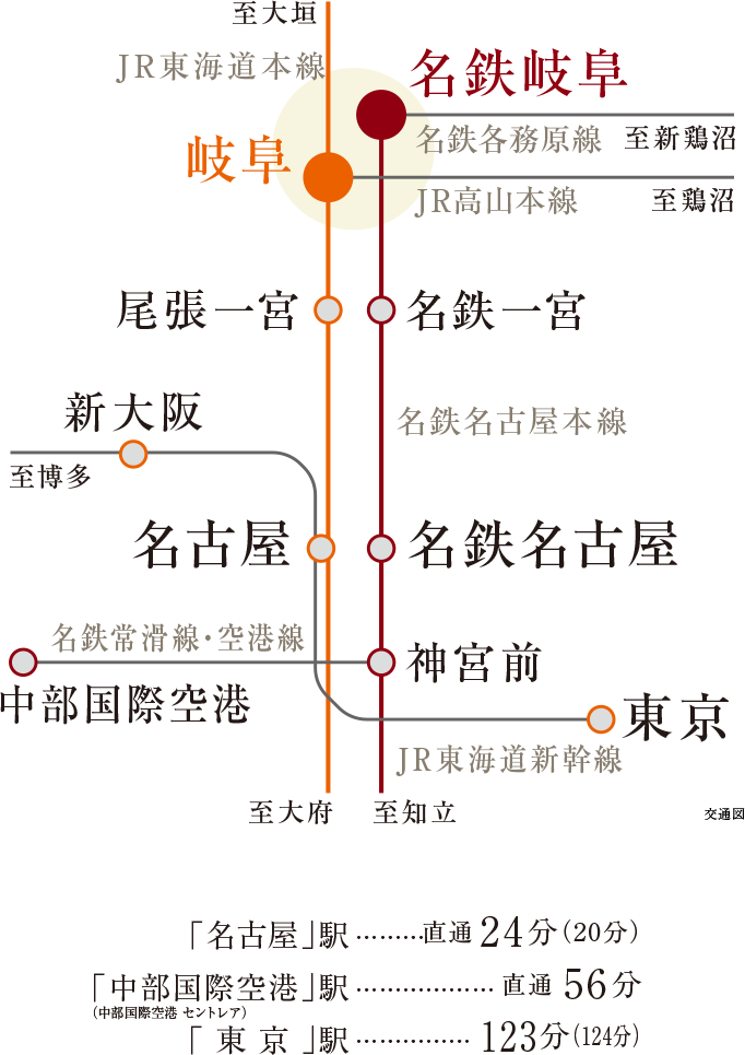 ※()は日中平常時となります。※「名古屋」駅:JR「岐阜」駅よりJR東海道本線(東海)快速利用(日中平常時/JR「岐阜」駅よりJR東海道本線(東海)新快速利用)※「中部国際空港」駅:「名鉄岐阜」駅よりニュースカイ(有料急行)利用、5:57分発のみ所要時間は61分となります。平日4本/1日運行※「東京」駅:JR「岐阜」駅よりJR東海道本線(東海)新快速利用、「名古屋」駅で新幹線のぞみ200号に乗り換え(日中平常時/JR「岐阜」駅よりJR東海道本線(東海)新快速利用、「名古屋」駅で新幹線のぞみ10号に乗り換え※各路線で最短の所要時間(乗り換えに要する時間を含む)を算出※通勤時=目的駅に7:30~9:00着、日中時=目的駅11:00~16:00着(2023年7月調べ)