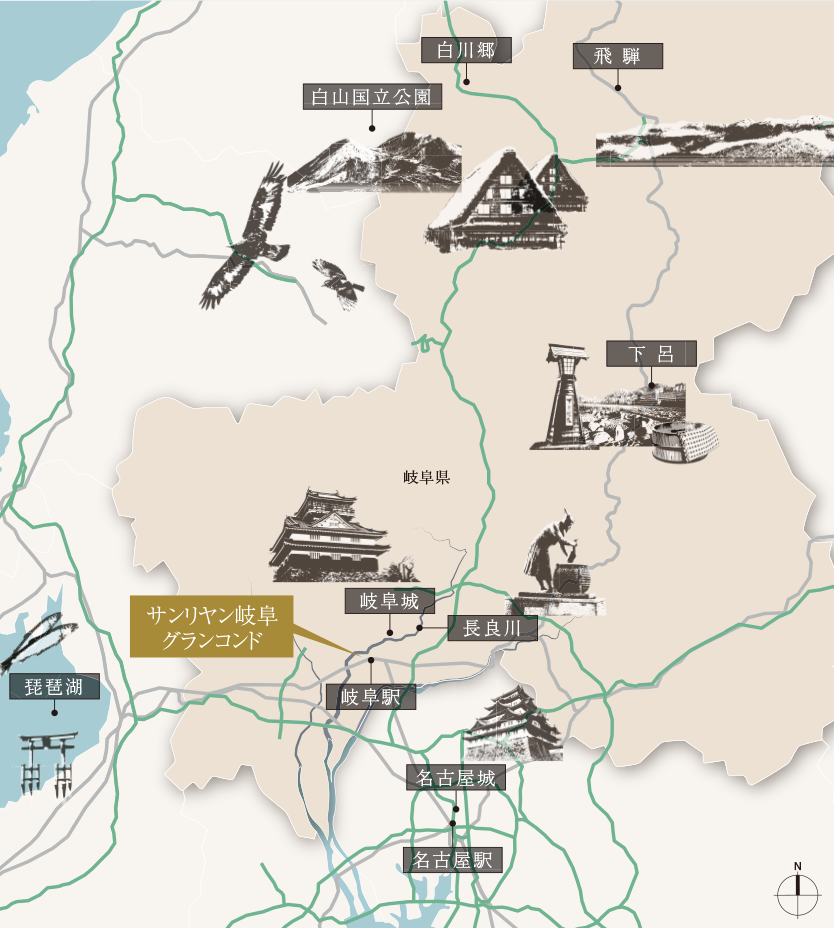 JR「岐阜」駅・「名鉄岐阜」駅を身近にする「サンリヤン岐阜グランコンド」。2駅4路線を駆使して、軽快なアクセスが実現しました。ビジネスもプライベートも大きく広がります。