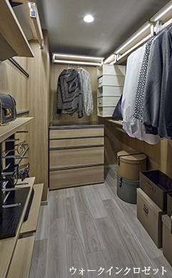 ゆったりとしたスペースを確保したウォークインクロゼットをご用意しています。衣服だけでなく帽子や小物、大切なアクセサリーなどもキレイに整理して収納できます。