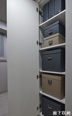 廊下などには家族みんなで利用できる収納スペースを配置しました。普段使わないものや家族の思い出の品などを分類してわかりやすくしまっておけます。